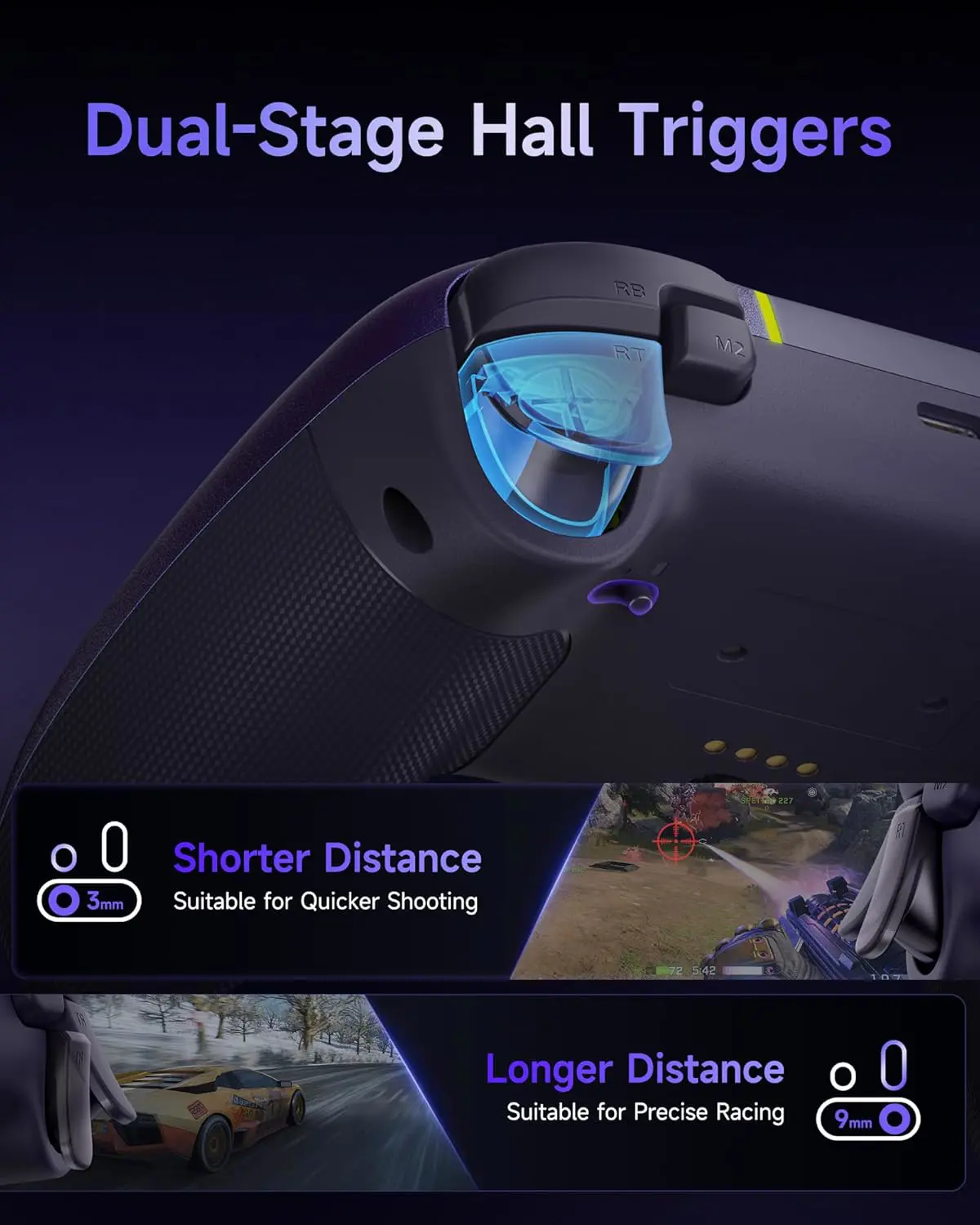 - Two-Stage Trigger Lock System – Switch between longer travel for precision racing games and shorter, instant response for FPS combat. The X05 Pro adapts to your playstyle in real time.