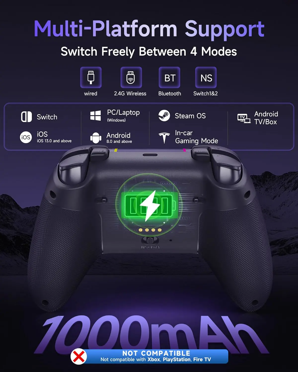- Other Features: Wide Compatibility with Quick Mode-switching toggle: 2.4Ghz Wireless/Bluetooth/Wired for PC, Switch, mobile and other handheld consoles; 1000mAh Battery Capacity; 2 Programmable Buttons on the top; RGB Lighting; Turbo;